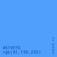 Цвет #519FFD в цветовой модели RGB обозначается тремя октетами (81, 159, 253) в десятичном формате и #519FFD в шестнадцатиричном (hex) формате, которые являются интенсивностью красного 81 (hex 51), интенсивность зелёного 159 (hex 9F) и интенсивность синего 253 (hex FD).