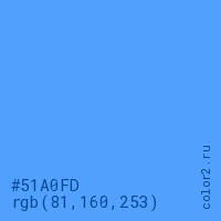 Цвет #51A0FD в цветовой модели RGB обозначается тремя октетами (81, 160, 253) в десятичном формате и #51A0FD в шестнадцатиричном (hex) формате, которые являются интенсивностью красного 81 (hex 51), интенсивность зелёного 160 (hex A0) и интенсивность синего 253 (hex FD).