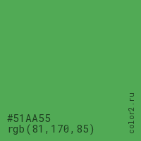 Цвет #51AA55 в цветовой модели RGB обозначается тремя октетами (81, 170, 85) в десятичном формате и #51AA55 в шестнадцатиричном (hex) формате, которые являются интенсивностью красного 81 (hex 51), интенсивность зелёного 170 (hex AA) и интенсивность синего 85 (hex 55).