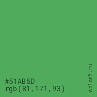Цвет #51AB5D в цветовой модели RGB обозначается тремя октетами (81, 171, 93) в десятичном формате и #51AB5D в шестнадцатиричном (hex) формате, которые являются интенсивностью красного 81 (hex 51), интенсивность зелёного 171 (hex AB) и интенсивность синего 93 (hex 5D).