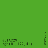 Цвет #51AC29 в цветовой модели RGB обозначается тремя октетами (81, 172, 41) в десятичном формате и #51AC29 в шестнадцатиричном (hex) формате, которые являются интенсивностью красного 81 (hex 51), интенсивность зелёного 172 (hex AC) и интенсивность синего 41 (hex 29).