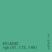 Цвет #51AD8C в цветовой модели RGB обозначается тремя октетами (81, 173, 140) в десятичном формате и #51AD8C в шестнадцатиричном (hex) формате, которые являются интенсивностью красного 81 (hex 51), интенсивность зелёного 173 (hex AD) и интенсивность синего 140 (hex 8C).