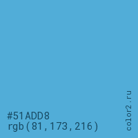 Цвет #51ADD8 в цветовой модели RGB обозначается тремя октетами (81, 173, 216) в десятичном формате и #51ADD8 в шестнадцатиричном (hex) формате, которые являются интенсивностью красного 81 (hex 51), интенсивность зелёного 173 (hex AD) и интенсивность синего 216 (hex D8).