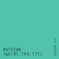 Цвет #51C2AB в цветовой модели RGB обозначается тремя октетами (81, 194, 171) в десятичном формате и #51C2AB в шестнадцатиричном (hex) формате, которые являются интенсивностью красного 81 (hex 51), интенсивность зелёного 194 (hex C2) и интенсивность синего 171 (hex AB).