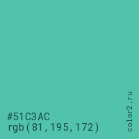 Цвет #51C3AC в цветовой модели RGB обозначается тремя октетами (81, 195, 172) в десятичном формате и #51C3AC в шестнадцатиричном (hex) формате, которые являются интенсивностью красного 81 (hex 51), интенсивность зелёного 195 (hex C3) и интенсивность синего 172 (hex AC).