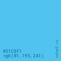 Цвет #51C3F1 в цветовой модели RGB обозначается тремя октетами (81, 195, 241) в десятичном формате и #51C3F1 в шестнадцатиричном (hex) формате, которые являются интенсивностью красного 81 (hex 51), интенсивность зелёного 195 (hex C3) и интенсивность синего 241 (hex F1).