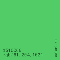 Цвет #51CC66 в цветовой модели RGB обозначается тремя октетами (81, 204, 102) в десятичном формате и #51CC66 в шестнадцатиричном (hex) формате, которые являются интенсивностью красного 81 (hex 51), интенсивность зелёного 204 (hex CC) и интенсивность синего 102 (hex 66).