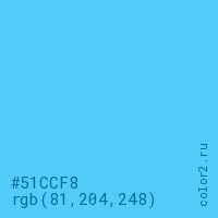 Цвет #51CCF8 в цветовой модели RGB обозначается тремя октетами (81, 204, 248) в десятичном формате и #51CCF8 в шестнадцатиричном (hex) формате, которые являются интенсивностью красного 81 (hex 51), интенсивность зелёного 204 (hex CC) и интенсивность синего 248 (hex F8).