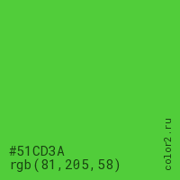 Цвет #51CD3A в цветовой модели RGB обозначается тремя октетами (81, 205, 58) в десятичном формате и #51CD3A в шестнадцатиричном (hex) формате, которые являются интенсивностью красного 81 (hex 51), интенсивность зелёного 205 (hex CD) и интенсивность синего 58 (hex 3A).