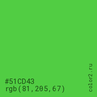 Цвет #51CD43 в цветовой модели RGB обозначается тремя октетами (81, 205, 67) в десятичном формате и #51CD43 в шестнадцатиричном (hex) формате, которые являются интенсивностью красного 81 (hex 51), интенсивность зелёного 205 (hex CD) и интенсивность синего 67 (hex 43).