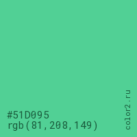 Цвет #51D095 в цветовой модели RGB обозначается тремя октетами (81, 208, 149) в десятичном формате и #51D095 в шестнадцатиричном (hex) формате, которые являются интенсивностью красного 81 (hex 51), интенсивность зелёного 208 (hex D0) и интенсивность синего 149 (hex 95).