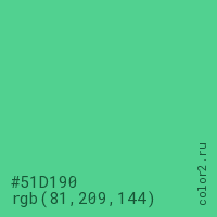 Цвет #51D190 в цветовой модели RGB обозначается тремя октетами (81, 209, 144) в десятичном формате и #51D190 в шестнадцатиричном (hex) формате, которые являются интенсивностью красного 81 (hex 51), интенсивность зелёного 209 (hex D1) и интенсивность синего 144 (hex 90).