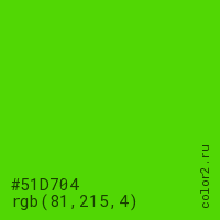 Цвет #51D704 в цветовой модели RGB обозначается тремя октетами (81, 215, 4) в десятичном формате и #51D704 в шестнадцатиричном (hex) формате, которые являются интенсивностью красного 81 (hex 51), интенсивность зелёного 215 (hex D7) и интенсивность синего 4 (hex 04).