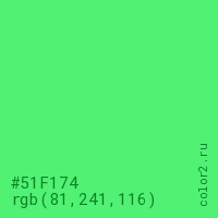 Цвет #51F174 в цветовой модели RGB обозначается тремя октетами (81, 241, 116) в десятичном формате и #51F174 в шестнадцатиричном (hex) формате, которые являются интенсивностью красного 81 (hex 51), интенсивность зелёного 241 (hex F1) и интенсивность синего 116 (hex 74).