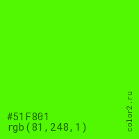 Цвет #51F801 в цветовой модели RGB обозначается тремя октетами (81, 248, 1) в десятичном формате и #51F801 в шестнадцатиричном (hex) формате, которые являются интенсивностью красного 81 (hex 51), интенсивность зелёного 248 (hex F8) и интенсивность синего 1 (hex 01).
