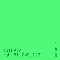 Цвет #51F97A в цветовой модели RGB обозначается тремя октетами (81, 249, 122) в десятичном формате и #51F97A в шестнадцатиричном (hex) формате, которые являются интенсивностью красного 81 (hex 51), интенсивность зелёного 249 (hex F9) и интенсивность синего 122 (hex 7A).