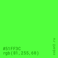 Цвет #51FF3C в цветовой модели RGB обозначается тремя октетами (81, 255, 60) в десятичном формате и #51FF3C в шестнадцатиричном (hex) формате, которые являются интенсивностью красного 81 (hex 51), интенсивность зелёного 255 (hex FF) и интенсивность синего 60 (hex 3C).