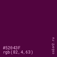 Цвет #52043F в цветовой модели RGB обозначается тремя октетами (82, 4, 63) в десятичном формате и #52043F в шестнадцатиричном (hex) формате, которые являются интенсивностью красного 82 (hex 52), интенсивность зелёного 4 (hex 04) и интенсивность синего 63 (hex 3F).
