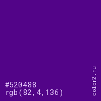 Цвет #520488 в цветовой модели RGB обозначается тремя октетами (82, 4, 136) в десятичном формате и #520488 в шестнадцатиричном (hex) формате, которые являются интенсивностью красного 82 (hex 52), интенсивность зелёного 4 (hex 04) и интенсивность синего 136 (hex 88).