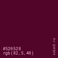 Цвет #520528 в цветовой модели RGB обозначается тремя октетами (82, 5, 40) в десятичном формате и #520528 в шестнадцатиричном (hex) формате, которые являются интенсивностью красного 82 (hex 52), интенсивность зелёного 5 (hex 05) и интенсивность синего 40 (hex 28).