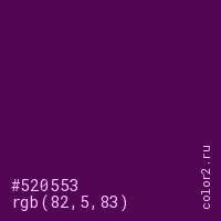 Цвет #520553 в цветовой модели RGB обозначается тремя октетами (82, 5, 83) в десятичном формате и #520553 в шестнадцатиричном (hex) формате, которые являются интенсивностью красного 82 (hex 52), интенсивность зелёного 5 (hex 05) и интенсивность синего 83 (hex 53).