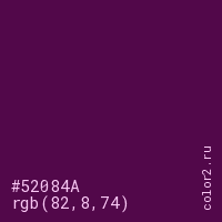 Цвет #52084A в цветовой модели RGB обозначается тремя октетами (82, 8, 74) в десятичном формате и #52084A в шестнадцатиричном (hex) формате, которые являются интенсивностью красного 82 (hex 52), интенсивность зелёного 8 (hex 08) и интенсивность синего 74 (hex 4A).