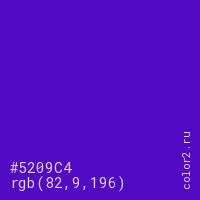 Цвет #5209C4 в цветовой модели RGB обозначается тремя октетами (82, 9, 196) в десятичном формате и #5209C4 в шестнадцатиричном (hex) формате, которые являются интенсивностью красного 82 (hex 52), интенсивность зелёного 9 (hex 09) и интенсивность синего 196 (hex C4).