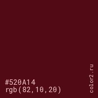 Цвет #520A14 в цветовой модели RGB обозначается тремя октетами (82, 10, 20) в десятичном формате и #520A14 в шестнадцатиричном (hex) формате, которые являются интенсивностью красного 82 (hex 52), интенсивность зелёного 10 (hex 0A) и интенсивность синего 20 (hex 14).