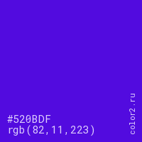 Цвет #520BDF в цветовой модели RGB обозначается тремя октетами (82, 11, 223) в десятичном формате и #520BDF в шестнадцатиричном (hex) формате, которые являются интенсивностью красного 82 (hex 52), интенсивность зелёного 11 (hex 0B) и интенсивность синего 223 (hex DF).