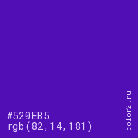 Цвет #520EB5 в цветовой модели RGB обозначается тремя октетами (82, 14, 181) в десятичном формате и #520EB5 в шестнадцатиричном (hex) формате, которые являются интенсивностью красного 82 (hex 52), интенсивность зелёного 14 (hex 0E) и интенсивность синего 181 (hex B5).