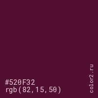 Цвет #520F32 в цветовой модели RGB обозначается тремя октетами (82, 15, 50) в десятичном формате и #520F32 в шестнадцатиричном (hex) формате, которые являются интенсивностью красного 82 (hex 52), интенсивность зелёного 15 (hex 0F) и интенсивность синего 50 (hex 32).