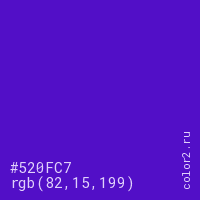 Цвет #520FC7 в цветовой модели RGB обозначается тремя октетами (82, 15, 199) в десятичном формате и #520FC7 в шестнадцатиричном (hex) формате, которые являются интенсивностью красного 82 (hex 52), интенсивность зелёного 15 (hex 0F) и интенсивность синего 199 (hex C7).