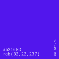 Цвет #5216ED в цветовой модели RGB обозначается тремя октетами (82, 22, 237) в десятичном формате и #5216ED в шестнадцатиричном (hex) формате, которые являются интенсивностью красного 82 (hex 52), интенсивность зелёного 22 (hex 16) и интенсивность синего 237 (hex ED).
