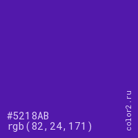 Цвет #5218AB в цветовой модели RGB обозначается тремя октетами (82, 24, 171) в десятичном формате и #5218AB в шестнадцатиричном (hex) формате, которые являются интенсивностью красного 82 (hex 52), интенсивность зелёного 24 (hex 18) и интенсивность синего 171 (hex AB).