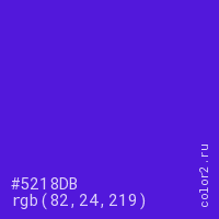 Цвет #5218DB в цветовой модели RGB обозначается тремя октетами (82, 24, 219) в десятичном формате и #5218DB в шестнадцатиричном (hex) формате, которые являются интенсивностью красного 82 (hex 52), интенсивность зелёного 24 (hex 18) и интенсивность синего 219 (hex DB).