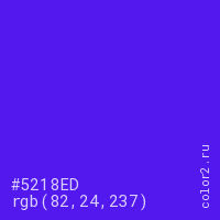 Цвет #5218ED в цветовой модели RGB обозначается тремя октетами (82, 24, 237) в десятичном формате и #5218ED в шестнадцатиричном (hex) формате, которые являются интенсивностью красного 82 (hex 52), интенсивность зелёного 24 (hex 18) и интенсивность синего 237 (hex ED).
