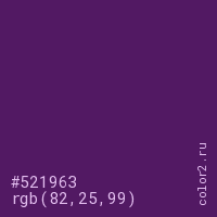 Цвет #521963 в цветовой модели RGB обозначается тремя октетами (82, 25, 99) в десятичном формате и #521963 в шестнадцатиричном (hex) формате, которые являются интенсивностью красного 82 (hex 52), интенсивность зелёного 25 (hex 19) и интенсивность синего 99 (hex 63).