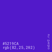 Цвет #5219CA в цветовой модели RGB обозначается тремя октетами (82, 25, 202) в десятичном формате и #5219CA в шестнадцатиричном (hex) формате, которые являются интенсивностью красного 82 (hex 52), интенсивность зелёного 25 (hex 19) и интенсивность синего 202 (hex CA).