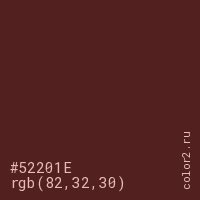 Цвет #52201E в цветовой модели RGB обозначается тремя октетами (82, 32, 30) в десятичном формате и #52201E в шестнадцатиричном (hex) формате, которые являются интенсивностью красного 82 (hex 52), интенсивность зелёного 32 (hex 20) и интенсивность синего 30 (hex 1E).