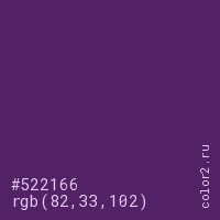 Цвет #522166 в цветовой модели RGB обозначается тремя октетами (82, 33, 102) в десятичном формате и #522166 в шестнадцатиричном (hex) формате, которые являются интенсивностью красного 82 (hex 52), интенсивность зелёного 33 (hex 21) и интенсивность синего 102 (hex 66).