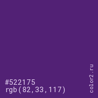 Цвет #522175 в цветовой модели RGB обозначается тремя октетами (82, 33, 117) в десятичном формате и #522175 в шестнадцатиричном (hex) формате, которые являются интенсивностью красного 82 (hex 52), интенсивность зелёного 33 (hex 21) и интенсивность синего 117 (hex 75).