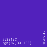 Цвет #5221BC в цветовой модели RGB обозначается тремя октетами (82, 33, 188) в десятичном формате и #5221BC в шестнадцатиричном (hex) формате, которые являются интенсивностью красного 82 (hex 52), интенсивность зелёного 33 (hex 21) и интенсивность синего 188 (hex BC).