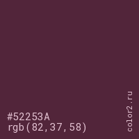 Цвет #52253A в цветовой модели RGB обозначается тремя октетами (82, 37, 58) в десятичном формате и #52253A в шестнадцатиричном (hex) формате, которые являются интенсивностью красного 82 (hex 52), интенсивность зелёного 37 (hex 25) и интенсивность синего 58 (hex 3A).