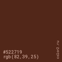 Цвет #522719 в цветовой модели RGB обозначается тремя октетами (82, 39, 25) в десятичном формате и #522719 в шестнадцатиричном (hex) формате, которые являются интенсивностью красного 82 (hex 52), интенсивность зелёного 39 (hex 27) и интенсивность синего 25 (hex 19).