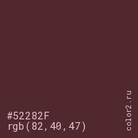 Цвет #52282F в цветовой модели RGB обозначается тремя октетами (82, 40, 47) в десятичном формате и #52282F в шестнадцатиричном (hex) формате, которые являются интенсивностью красного 82 (hex 52), интенсивность зелёного 40 (hex 28) и интенсивность синего 47 (hex 2F).