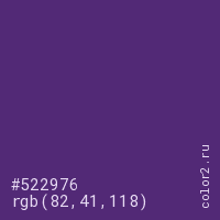 Цвет #522976 в цветовой модели RGB обозначается тремя октетами (82, 41, 118) в десятичном формате и #522976 в шестнадцатиричном (hex) формате, которые являются интенсивностью красного 82 (hex 52), интенсивность зелёного 41 (hex 29) и интенсивность синего 118 (hex 76).
