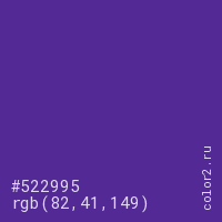 Цвет #522995 в цветовой модели RGB обозначается тремя октетами (82, 41, 149) в десятичном формате и #522995 в шестнадцатиричном (hex) формате, которые являются интенсивностью красного 82 (hex 52), интенсивность зелёного 41 (hex 29) и интенсивность синего 149 (hex 95).