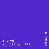 Цвет #5229CE в цветовой модели RGB обозначается тремя октетами (82, 41, 206) в десятичном формате и #5229CE в шестнадцатиричном (hex) формате, которые являются интенсивностью красного 82 (hex 52), интенсивность зелёного 41 (hex 29) и интенсивность синего 206 (hex CE).