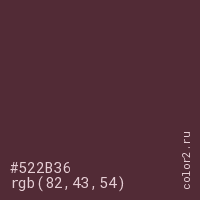 Цвет #522B36 в цветовой модели RGB обозначается тремя октетами (82, 43, 54) в десятичном формате и #522B36 в шестнадцатиричном (hex) формате, которые являются интенсивностью красного 82 (hex 52), интенсивность зелёного 43 (hex 2B) и интенсивность синего 54 (hex 36).