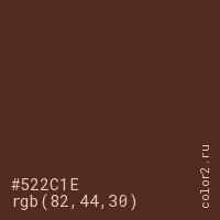 Цвет #522C1E в цветовой модели RGB обозначается тремя октетами (82, 44, 30) в десятичном формате и #522C1E в шестнадцатиричном (hex) формате, которые являются интенсивностью красного 82 (hex 52), интенсивность зелёного 44 (hex 2C) и интенсивность синего 30 (hex 1E).